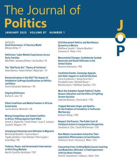 A matter of representation: Spatial voting and inconsistent policy preferencesLukas F StoetzerBritish Journal of Political Science 2019The application of spatial voting theories to popular elections presupposes an electorate that chooses political representatives on the basis of their well-structured policy preferences. Behavioral researchers have long contended that parts of the electorate instead hold unstructured and inconsistent policy beliefs. This article proposes an extension to spatial voting theories to analyze the effect of varying consistency in policy preferences on electoral behavior. The model results in the expectation that voters with less consistent policy preferences will put less weight on policy distance when learning about candidates who should represent their political positions. The study tests this expectation for the 2008 US presidential election, and finds that for respondents with less consistent self-placements on the liberal–conservative scale, policy distance less strongly affects their voting decision. The results have implications for the quality of political representation, as certain parts of the electorate are expected to be less closely represented.