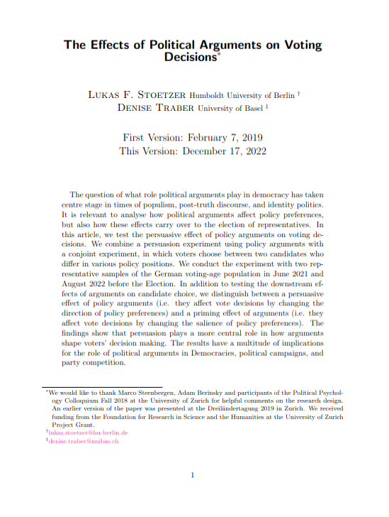 The Effect of Political Arguments on Voting DecisionsLukas F Stoetzer, and Denise TraberSwiss Political Science Association (SPSA) Annual Conference in Zurich 2019 and Midwest Political Science Association conference in Chicago 2019. 2019The question of what role political arguments play in democracy has taken centre stage in times of populism, post-truth discourse, and identity politics. It is relevant to analyse how political arguments affect policy preferences, but also how these effects carry over to the election of representatives. In this article, we test the persuasive effect of policy arguments on voting decisions. We combine a persuasion experiment using policy arguments with a conjoint experiment, in which voters choose between two candidates who differ in various policy positions. We conduct the experiment with two representative samples of the German voting-age population in June 2021 and August 2022 before the Election. In addition to testing the downstream effects of arguments on candidate choice, we distinguish between a persuasive effect of policy arguments (i.e. they affect vote decisions by changing the direction of policy preferences) and a priming effect of arguments (i.e. they affect vote decisions by changing the salience of policy preferences). The findings show that persuasion plays a more central role in how arguments shape voters’ decision making. The results have a multitude of implications for the role of political arguments in Democracies, political campaigns, and party competition.