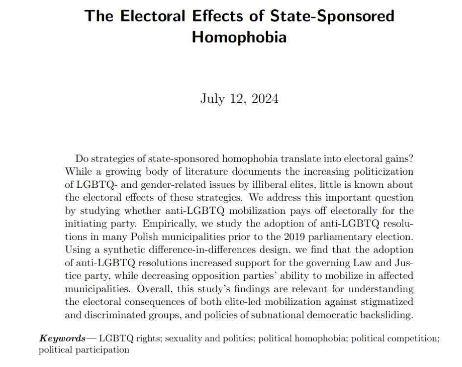 The Electoral Effects of State-Sponsored Homophobia Test2024Do strategies of state-sponsored homophobia translate into electoral gains? While a growing body of literature documents the increasing politicization of LGBTQ- and gender-related issues by illiberal elites, little is known about the electoral effects of these strategies. We address this important question by studying whether anti-LGBTQ mobilization pays off electorally for the initiating party. Empirically, we study the adoption of anti-LGBTQ resolutions in many Polish municipalities prior to the 2019 parliamentary election. Using a synthetic difference-in-differences design, we find that the adoption of anti-LGBTQ resolutions increased support for the governing Law and Justice party, while decreasing opposition parties’ ability to mobilize in affected municipalities. Overall, this study’s findings are relevant for understanding the electoral consequences of both elite-led mobilization against stigmatized and discriminated groups, and policies of subnational democratic backsliding.