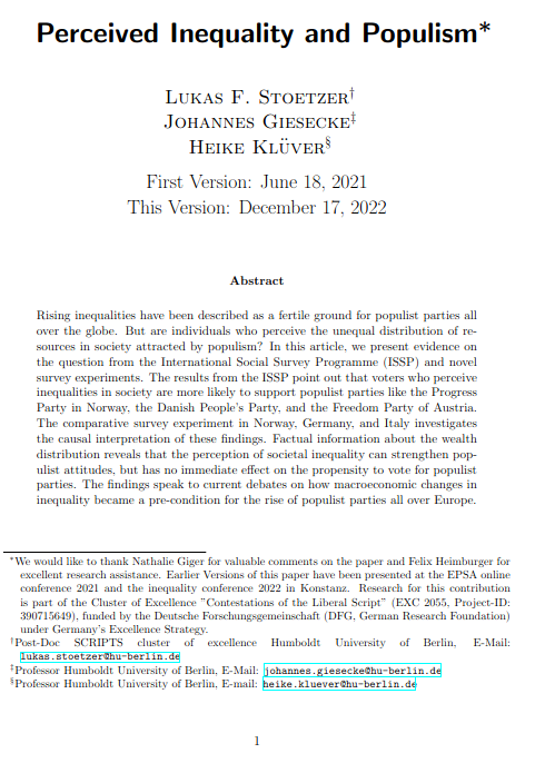 Perceived Inequality and PopulismLukas F Stoetzer, Heike Klüver, and Johannes GieseckeEuropean Political Science Association Conference 2021 and Inequality Conference, University of Konstanz 2022 2023Rising inequalities have been described as a fertile ground for populist parties all over the globe. In this article, we argue that the perception of Inequality alone can strengthen populist attitudes and increase support for populist parties. Using data from the International Social Survey Programme, we find that those who perceive greater inequality in society are more likely to support populist parties. To explore the causal relationship, the study also conducts a survey experiment in Denmark, Germany, and Italy, randomly exposing participants to factual information about the wealth distribution. The results show that the perception of inequality can increase populist attitudes, but does not immediate affect the likelihood of voting for populist parties in this context. The findings speak to current debates on how inequality and their perception became a pre-condition for the rise of populist parties all over Europe.