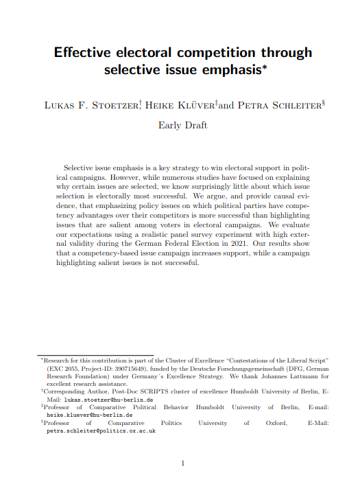 Effective electoral competition through selective issue emphasisLukas F Stoetzer, Heike Klüver, and Petra SchleiterAmerican European Political Science Association Conference 2022. 2022Selective issue emphasis is a key strategy to win electoral support in political campaigns. However, while numerous studies have focused on explaining why certain issues are selected, we know surprisingly little about which issue selection is electorally most successful. We argue, and provide causal evidence, that emphasizing policy issues on which political parties have competency advantages over their competitors is more successful than highlighting issues that are salient among voters in electoral campaigns. We evaluate our expectations using a realistic panel survey experiment with high external validity during the German Federal Election in 2021. Our results show that a competency-based issue campaign increases support, while a campaign highlighting salient issues is not successful.