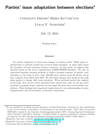 Parties’ issue adaptation between electionsCornelius Erfort, Heike Klüver, and Lukas F. Stoetzer2024Are parties responsive to short-term changes in election polls? While party responsiveness to election results has received much attention, we know little about the dynamics of issue attention between elections. In this study, we address this question based on the novel comprehensive PARTYPRESS Database. We rely on supervised machine learning methods to build a dynamic measure of parties’ issue attention on the basis of more than 250,000 press releases from 68 parties across nine countries from 2010 until 2020. We find little support that losing in the polls leads parties to change their issue attention. When political parties lose support in the polls, they do not clearly prioritise their owned issue, they do not pay more attention to popular issues, and they do not adapt the issue focus of successful competitors. These findings have important implications for our understanding of party responsiveness and the dynamics of electoral competition.