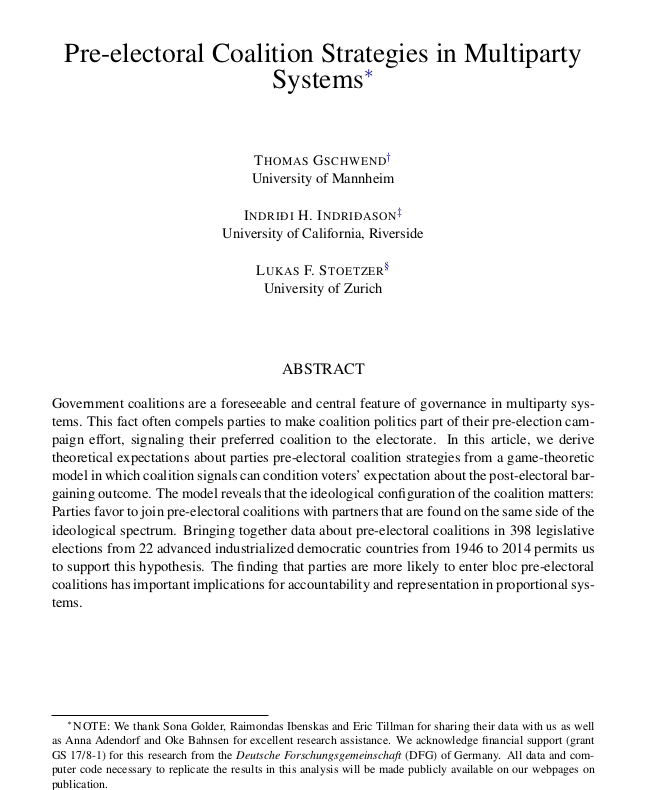 Pre-electoral Coalition Strategies in Multiparty SystemsThomas Gschwend, Lukas F Stoetzer, and Indridi IndridasonEuropean Political Science AssociationConference 2018 and Swiss Political Science Association (SPSA) Annual Conference in Zurich 2019 and 2021. 2021Government coalitions are a foreseeable and central feature of governance in multiparty systems. This fact often compels parties to make coalition politics part of their pre-election campaign effort, signaling their preferred coalition to the electorate. In this article, we derive theoretical expectations that take voters reaction to pre-electoral coalitions into account under what conditions pre-electoral coalitions form and which parties form such coalitions. The model reveals that the ideological configuration of the coalition matters: Parties favor joining pre-electoral coalitions with partners that are found on the same side of the ideological spectrum. Bringing together data about pre-electoral coalitions in 398 legislative elections from 22 advanced industrialized democratic countries from 1946 to 2014 permits us to support this hypothesis. The finding that parties are more likely to enter bloc pre-electoral coalitions has important implications for accountability and representation in proportional systems.