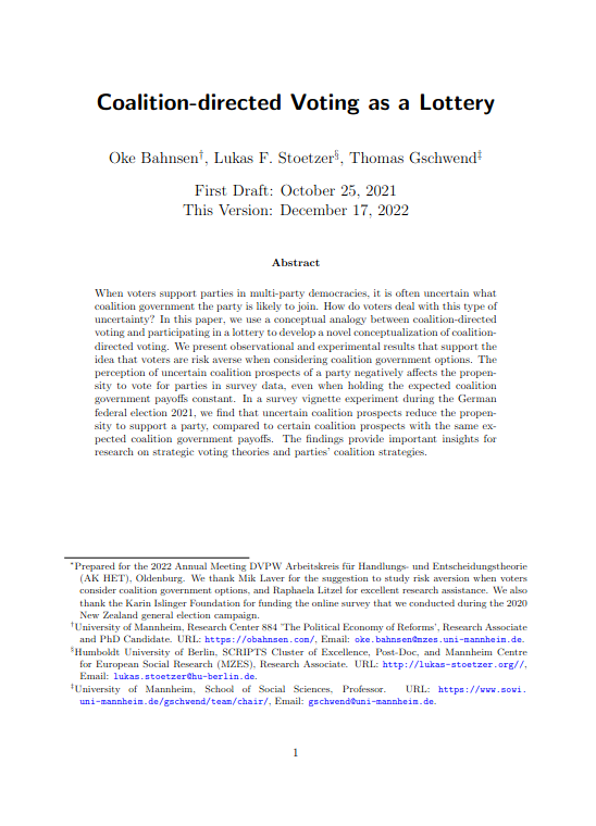 Coalition-directed Voting under UncertaintyOke Bahnsen, Lukas F Stoetzer, and Thomas GschwendWorkshop on Coalition Politics Humboldt University 2022 2022When voters support parties in multi-party democracies, it is often uncertain what coalition government the party is likely to join. How do voters deal with this type of uncertainty? In this paper, we use a conceptual analogy between coalition-directed voting and participating in a lottery to develop a novel conceptualization of coalition-directed voting. We present observational and experimental results that support the idea that voters are risk averse when considering coalition government options. The perception of uncertain coalition prospects of a party negatively affects the propensity to vote for parties in survey data, even when holding the expected coalition government payoffs constant. In a survey vignette experiment during the German federal election 2021, we find that uncertain coalition prospects reduce the propensity to support a party, compared to certain coalition prospects with the same expected coalition government payoffs. The findings provide important insights for research on strategic voting theories and parties’ coalition strategies.
