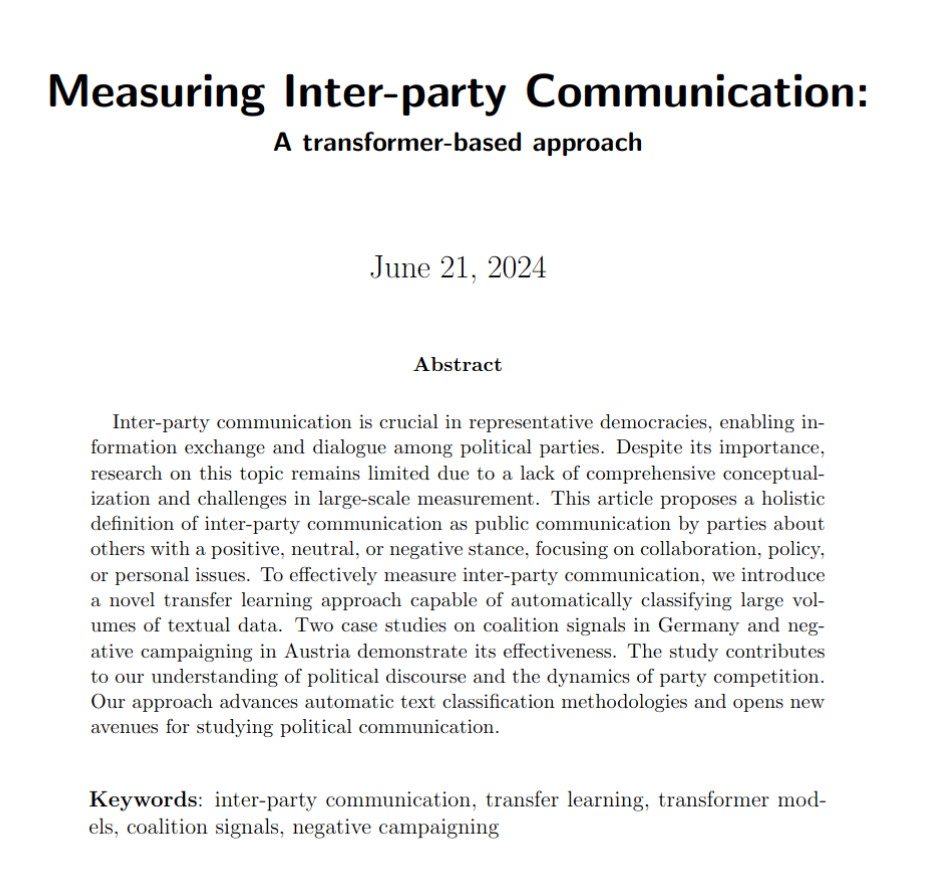 Measuring Inter-party Communication: A transformer-based approachAnna Adendorf, Oke Bahnsen, Thomas Gschwend, Lena Huber, Simone Paolo Ponzetto, Ines Rehbein, and Lukas F. Stoetzer2022Inter-party communication is crucial in representative democracies, enabling information exchange and dialogue among political parties. Despite its importance, research on this topic remains limited due to a lack of comprehensive conceptualization and challenges in large-scale measurement. This article proposes a holistic definition of inter-party communication as public communication by parties about others with a positive, neutral, or negative stance, focusing on collaboration, policy, or personal issues. To effectively measure inter-party communication, we introduce a novel transfer learning approach capable of automatically classifying large volumes of textual data. Two case studies on coalition signals in Germany and negative campaigning in Austria demonstrate its effectiveness. The study contributes to our understanding of political discourse and the dynamics of party competition. Our approach advances automatic text classification methodologies and opens new avenues for studying political communication.